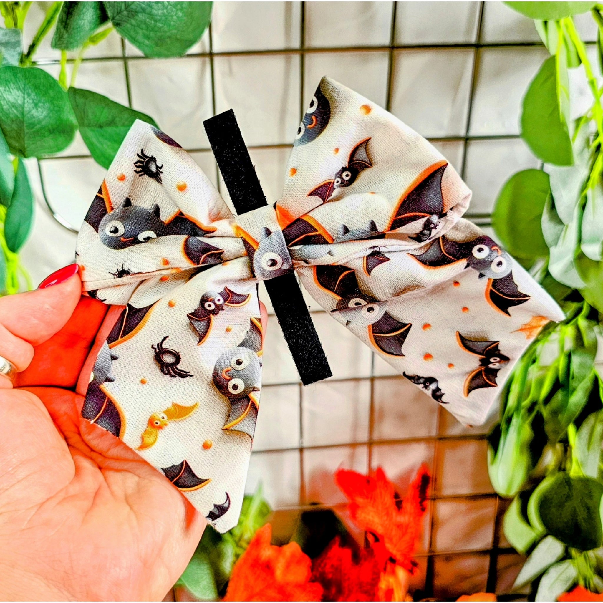 Complete your doggo's trick or treatin look with a stunning high quality bow tie that features the cutest lil fang-tastic bats on a pumpkin patch adding a playful touch to every dogs collar or harness. The perfect Halloween treat!